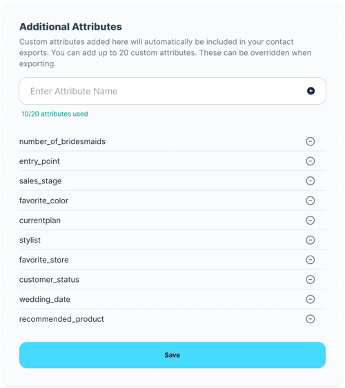 This section allows you to add Custom attributes you desire to include in your contacts, you are able to add up to 20 Custom Attributes per Download.