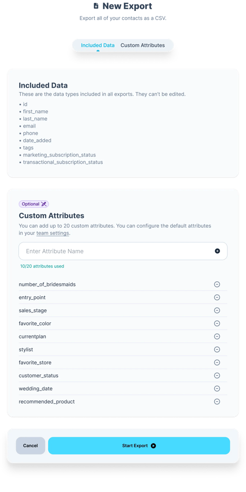 Flexibility: You choose which custom attributes to include (up to 20) so you don’t export a bunch of unnecessary fields.