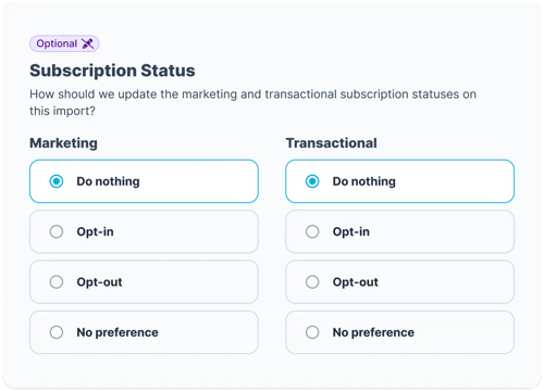 | Do Nothing | In this scenario, the import will keep each contact subscription status defined in the file, if they are not defined they will be imported as "No Preference" |