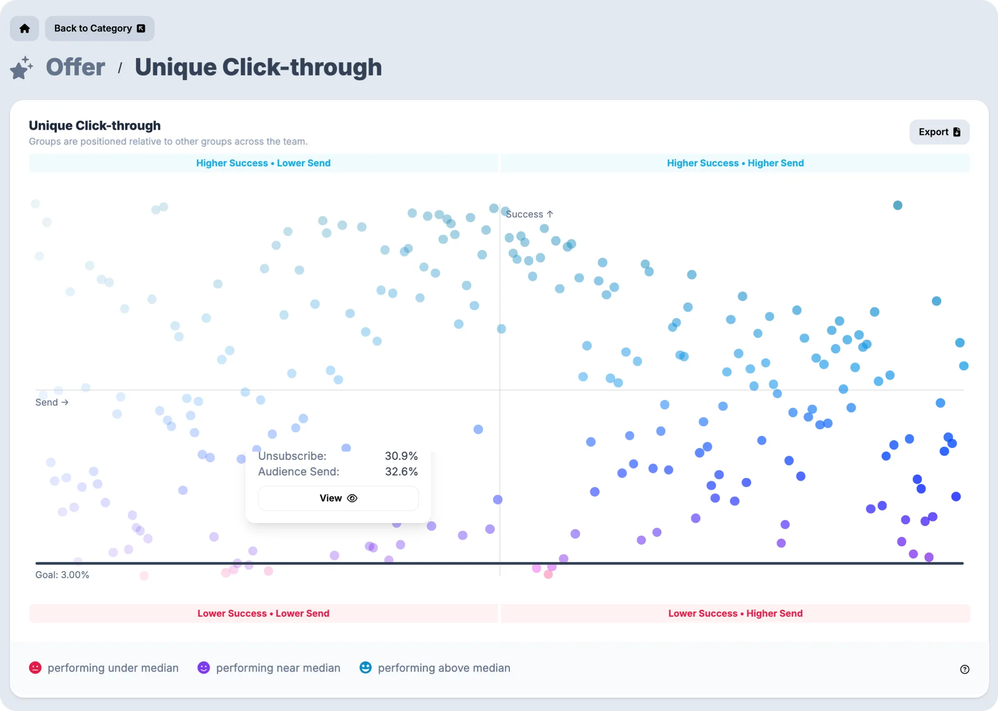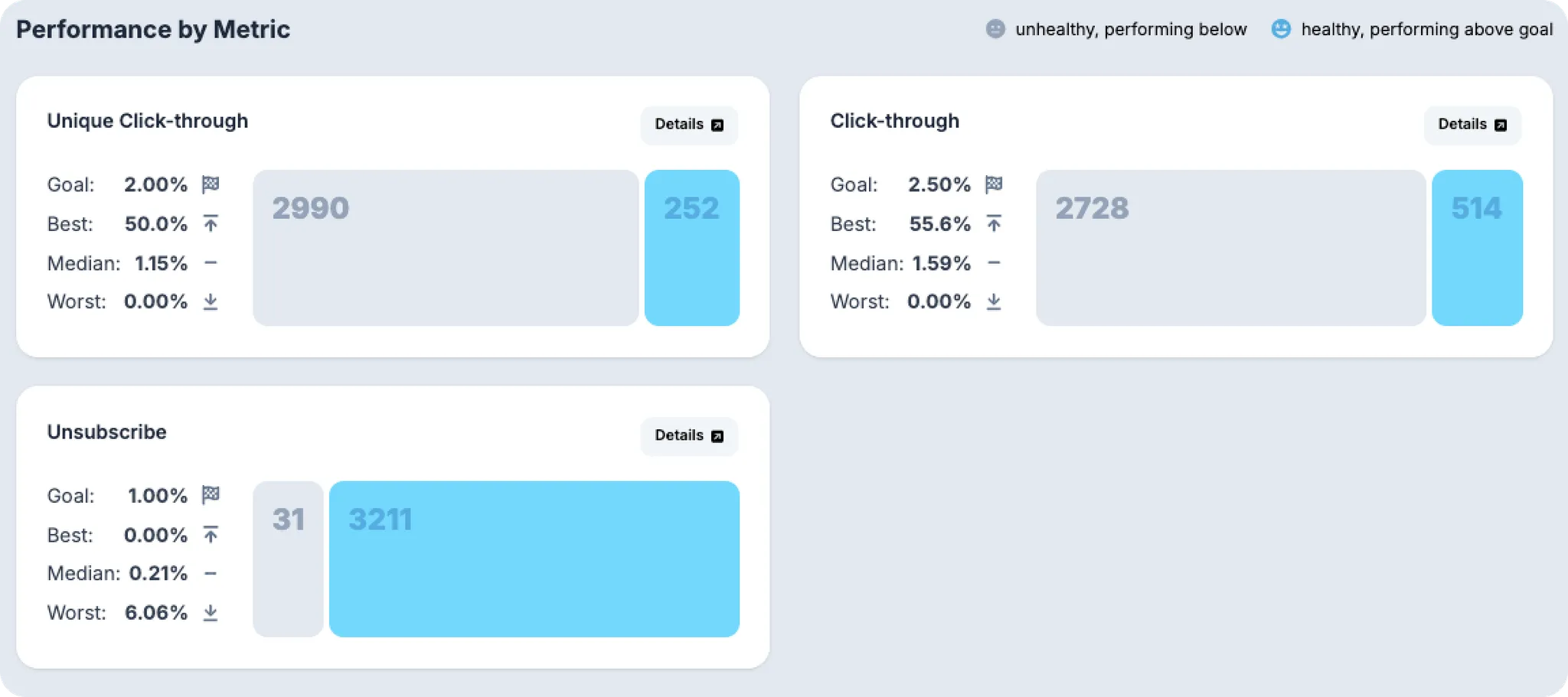 - 📊 Performance Metric Cards: See your corporate goal, the best and worst performing values, and how many groups are above or below the goal for CTR, uCTR, Unsubscribe, and Reply Rates