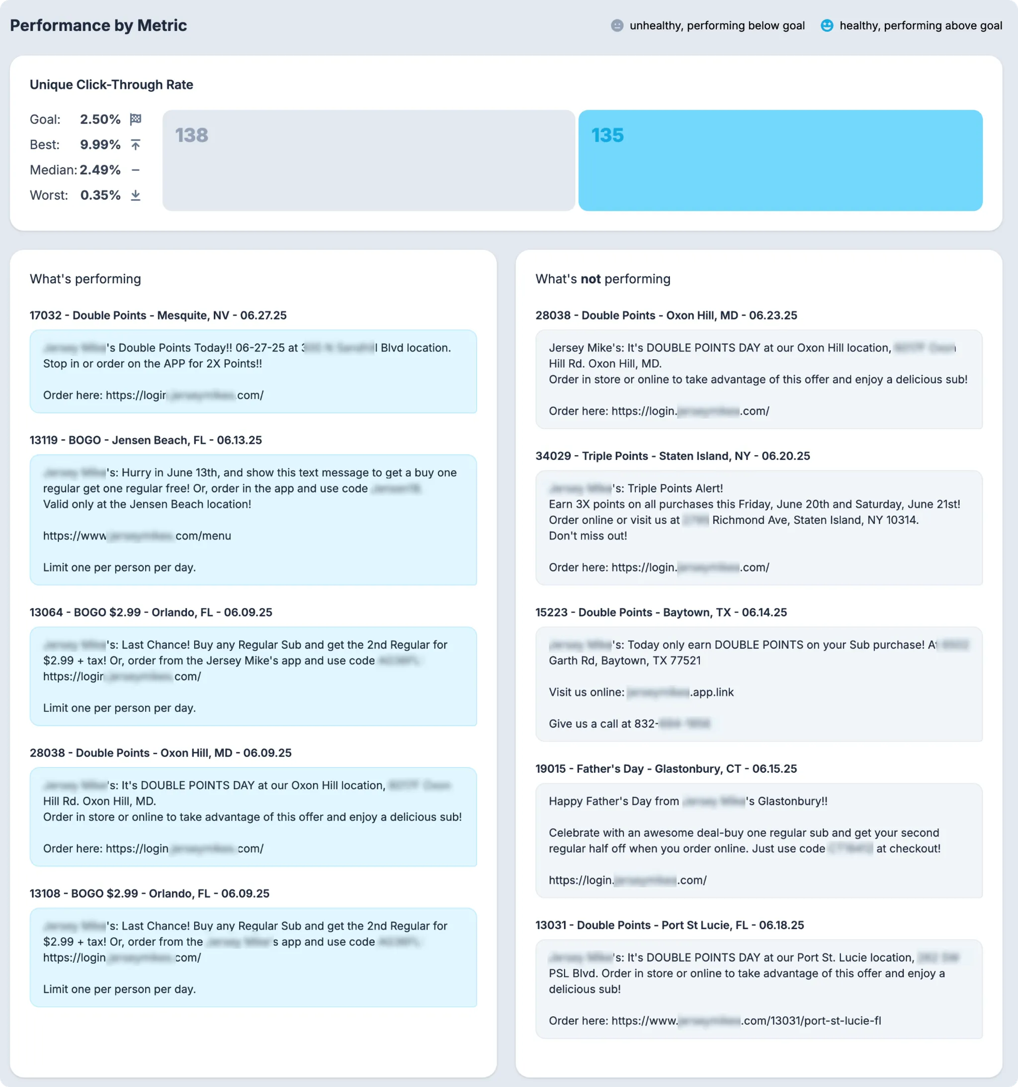 Helps optimize message types, campaigns, automations by seeing what’s working across many locations