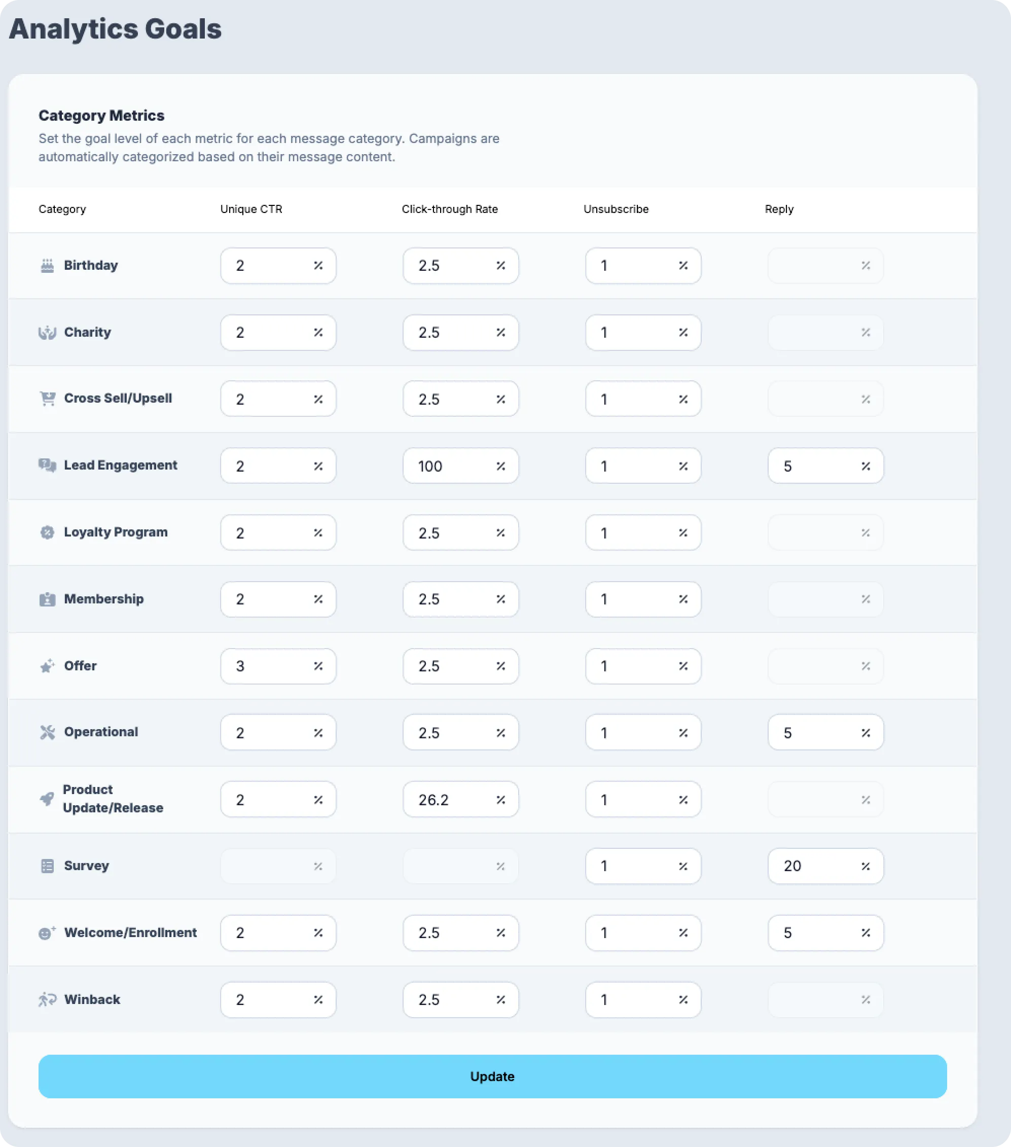 The Analytics Goals (Settings > Team Settings > Analytics Goals) screen lets you define the target values for each performance metric across all supported message categories (use cases). These goals become the benchmark used throughout Franchise Hub Analytics — helping you evaluate which franchise groups are meeting expectations and which ones need follow-up.