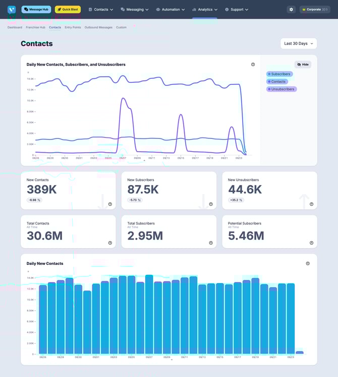Contacts Analytics is a feature that lets you monitor and evaluate how your contact base is evolving over time — specifically in terms of new contacts, opt-in / opt-out behavior, and the pool of “potential” contacts. It gives you high-level metrics and charts about how people are entering, leaving, or behaving relative to marketing subscription status.