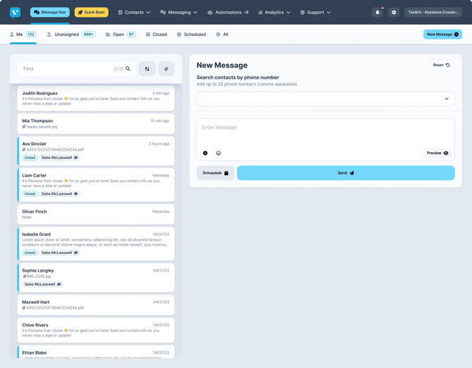 Your inboxes appear underneath the Voxie Nav Bar and are the first thing you should see when you navigate to Enterprise Message Hub from anywhere in the platform. There are 5 possible inboxes you could be working in. The Inbox section’s main purpose is to provide you with visibility into which conversations need to be actioned and which are being handled by yourself or another user. By clicking into each inbox, you are able to see the conversations that are occurring or have occurred. Here you also have the ability to search, action, filter, or start a new conversation.