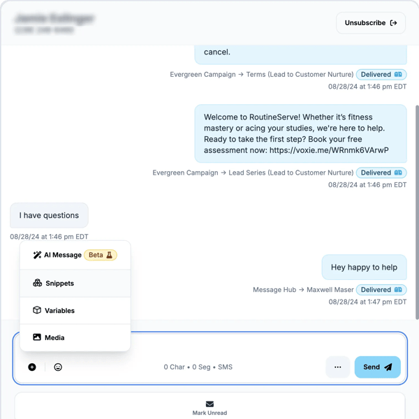 • Unassigned: The Unassigned inbox is the default inbox that will be opened when you log into Voxie and navigate to Enterprise Message Hub. The Unassigned inbox provides you with all of the conversations that are active, open, and need to be assigned and responded to. If you want to respond to a message while a conversation is in the Unassigned inbox, you have two options: Close With Snippet or Respond. Close With Template will respond to the message with a pre-made snippet and send the conversation to the Closed inbox. Respond will move the conversation to the Me inbox and let you type a response.
