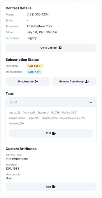 • Context at your fingertips: You can edit contact details, custom attributes, and subscription status directly inside the hub, without leaving the conversation view.