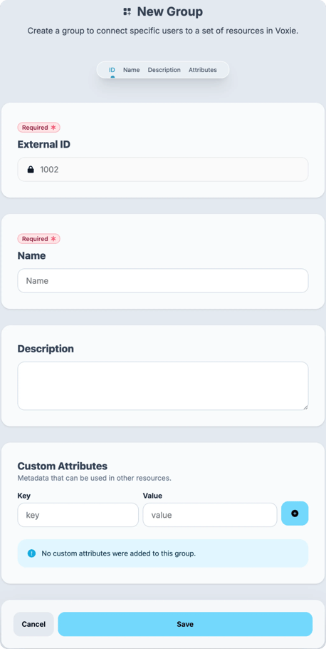 In order to create a Group you’ll need to provide an ID, we call it External ID, and we do it so, to replicate your Location or Department designation (ID), so you can have an Integrated match between your centralized management and Voxie.