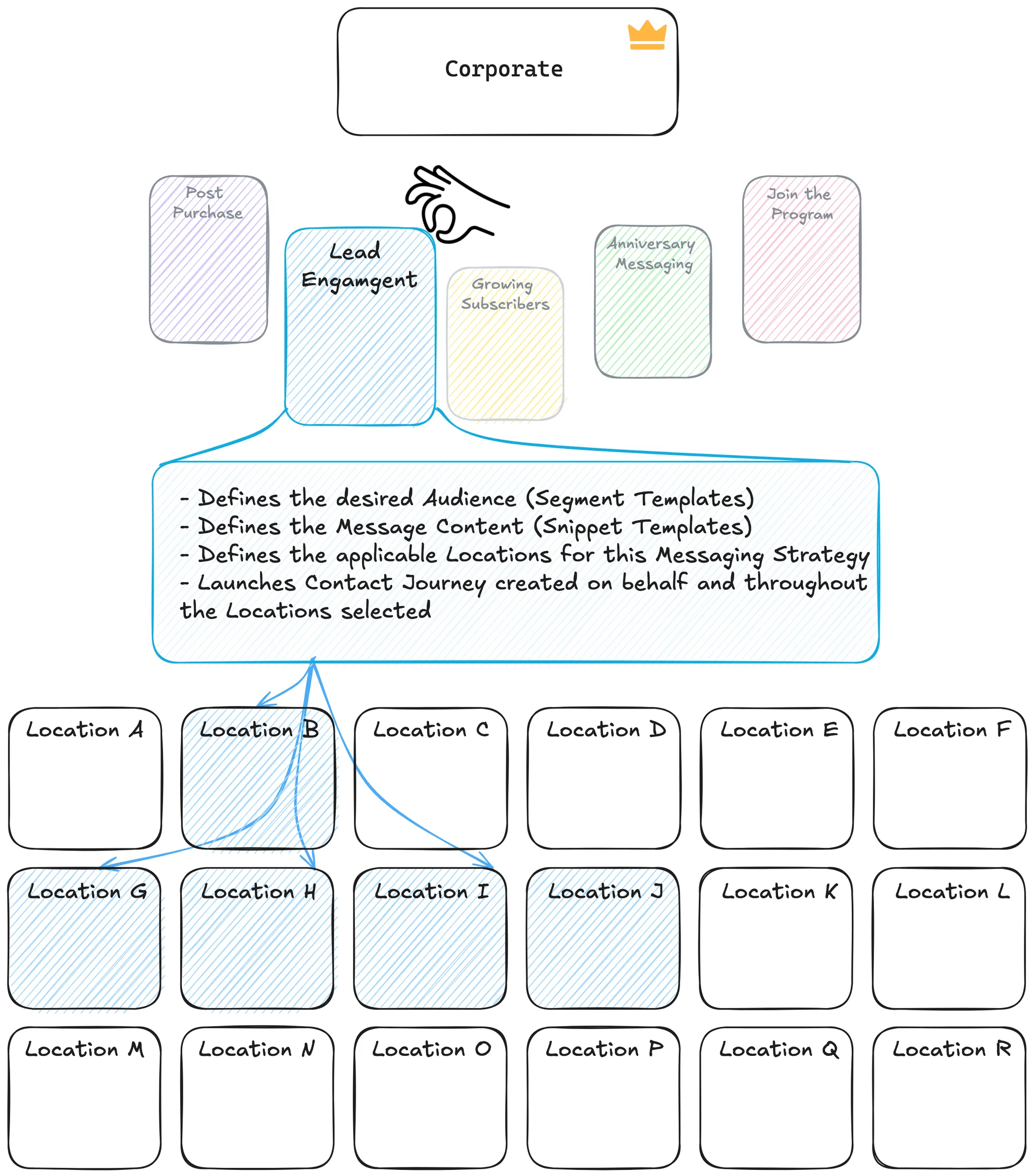 Because corporate defines the core strategies, audiences, and messaging logic, you ensure brand consistency across all locations while still enabling local relevance. -