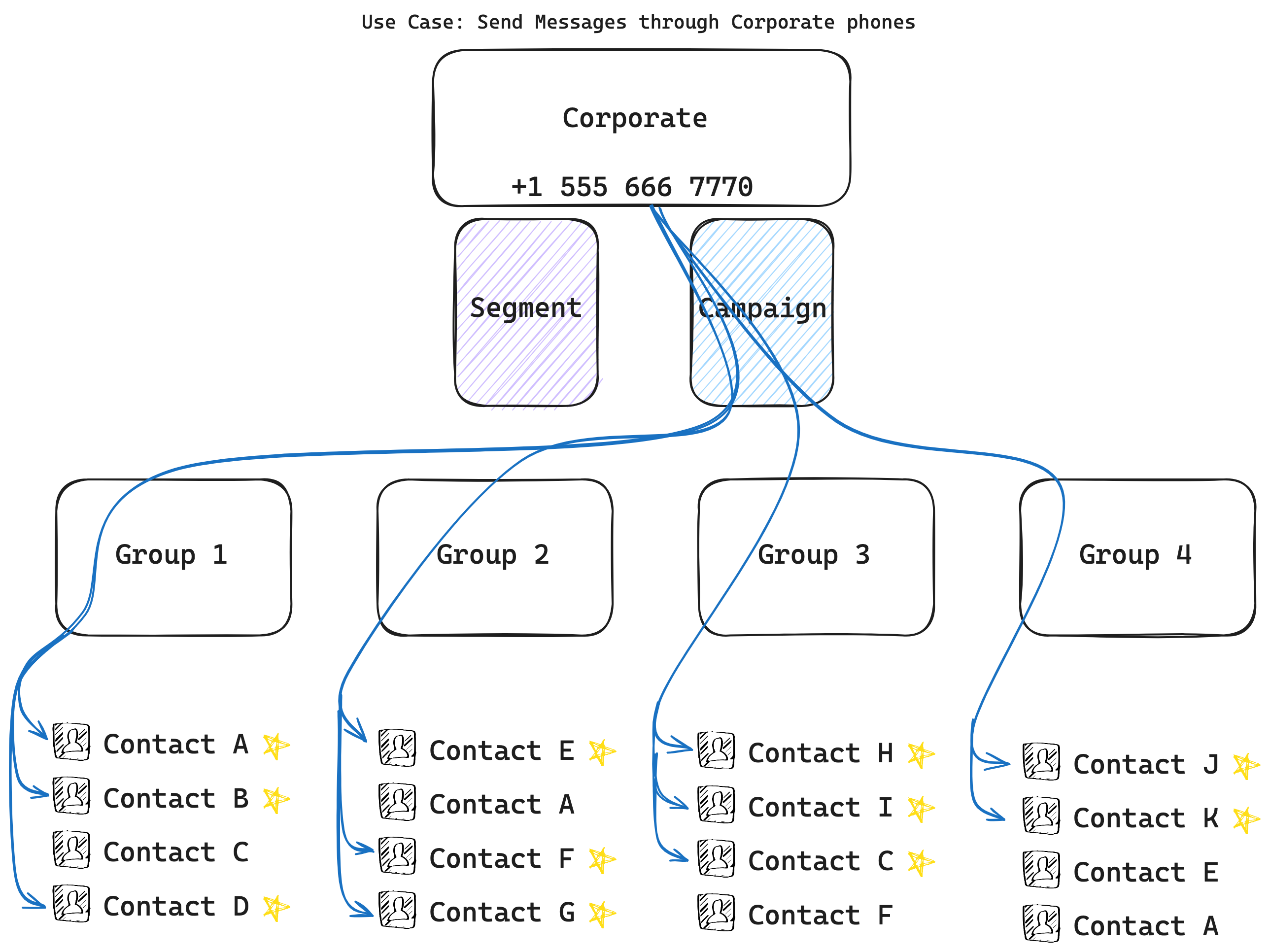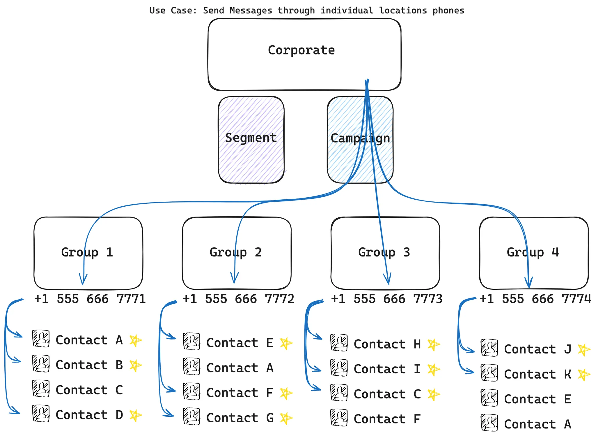 - Corporate Issues a Campaign, and decides that Messages will be sent through Individual Group’s Phone Numbers