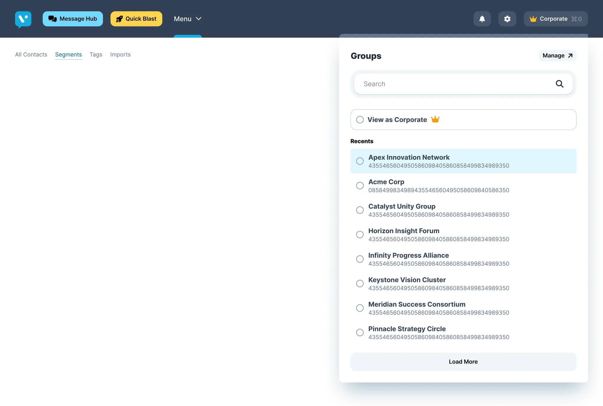 - Each Group (Location) has it’s Phone Number, and therefore Message Hub will be Available in each location. Furthermore, Corporate can send centralized Mass Messaging throughout each individual phone number. In this scenario, is where “Preferred” Contacts are relevant, so Contacts don’t receive the same message issued by Corporate from different Sources