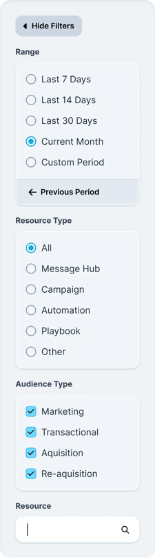 • Resource-level breakdown: You can see which Voxie resource (Campaigns, Automations, etc.) is sending how many messages and how well each is doing.