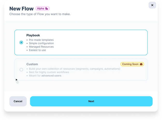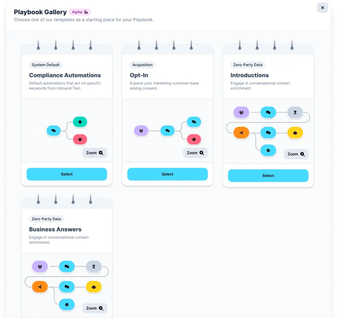 Playbooks are pre-built, Voxie-approved templated flows (also called “flows”) that you can deploy and customize. They serve common use cases (like acquiring new subscribers, collecting profile information, compliance flows) so you don’t have to build every automation from scratch.