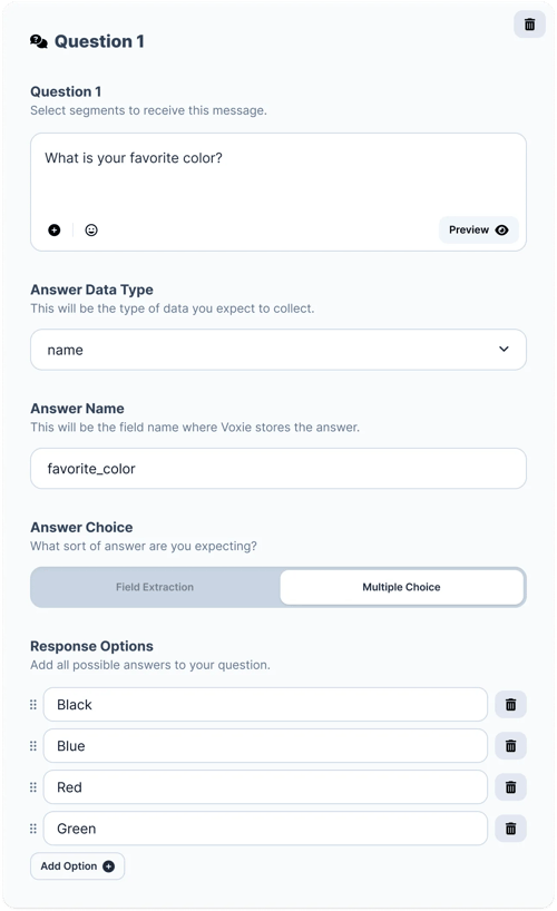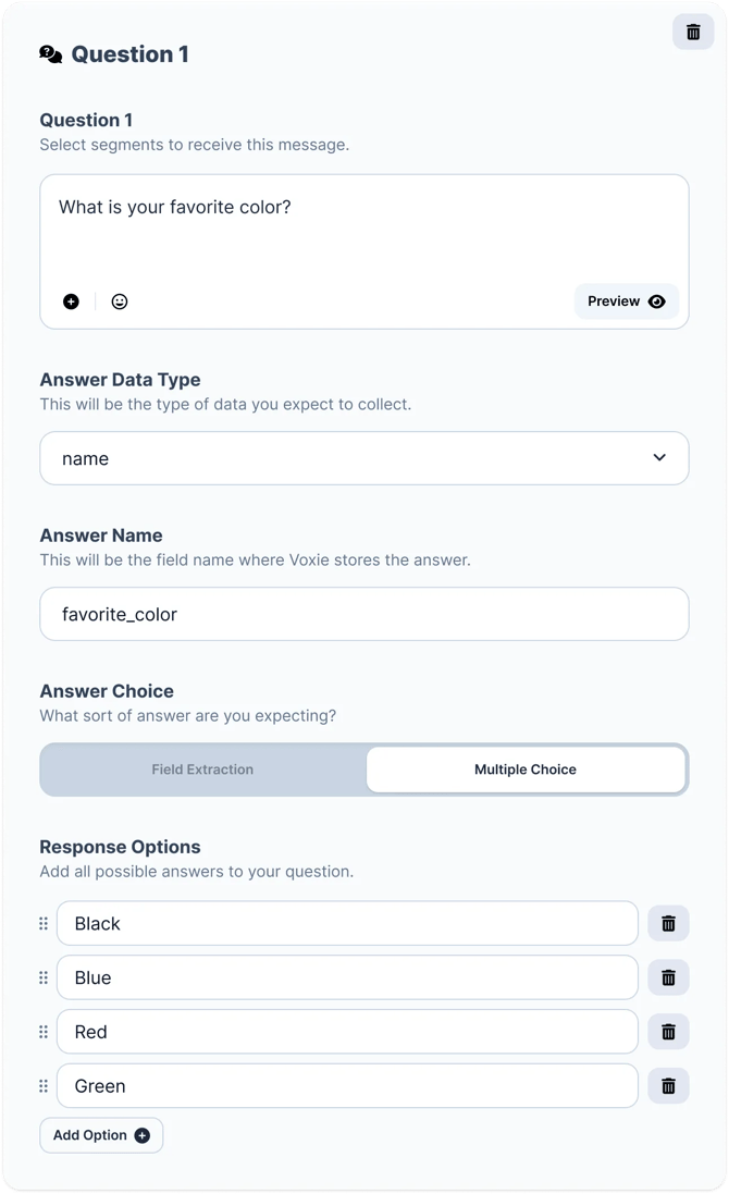 Answer Data Type: Define the Type of Answer you are expecting, depending on it, Voxie will let you know if it can be collected directly with our AI Engine