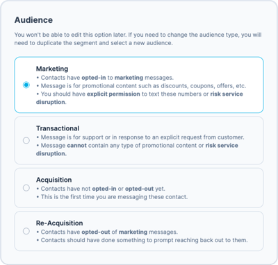 Audience Type: Marketing, Transactional, Acquisition or Re-Acquisition