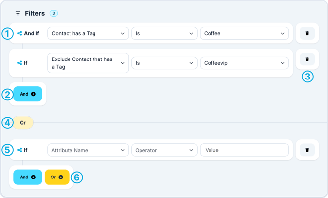 You will see under the coffee group the word OR. Anytime you add a group you are adding another OR function. This means the contacts must fall within one of these groups (in the dashed lines) to be part of the segment.