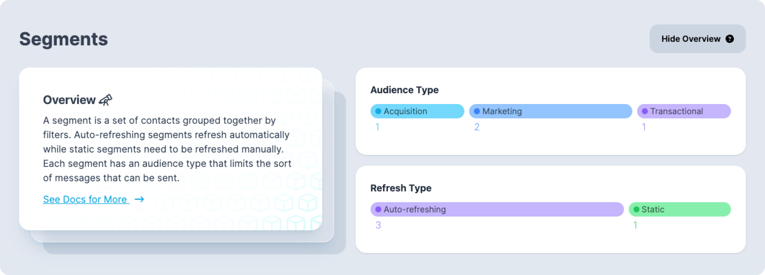 You decide who goes into each segment (via filters), and you can configure whether the segment updates automatically or stays static. Segments also have “types” (marketing, transactional, acquisition, etc.) that help think about how you’ll use them later.