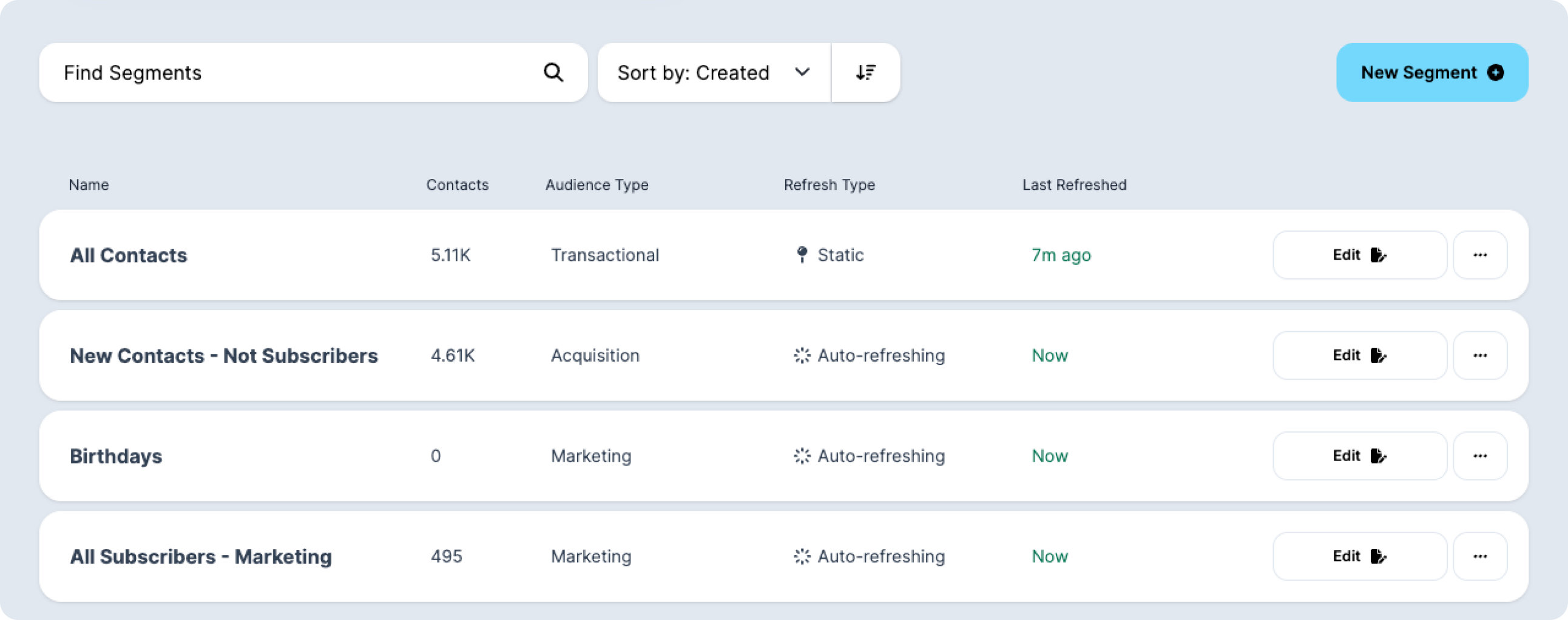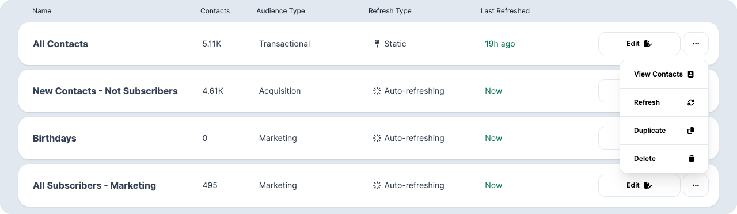 Edit: The Edit button will bring you to the page where you initially configured the segment. Make any changes there and remember to click the “Update Segment” button under the group.View Contacts: Once you see contacts in your campaign you can select View Contacts to see a list of those who are in this specific segment.