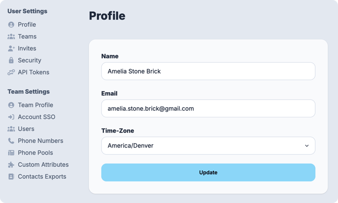 Lastly, in the Profile Details box, you can update your timezone to reflect the one you reside or are working in. If you update the timezone, your scheduled campaigns and message history will now reflect this timezone as well.