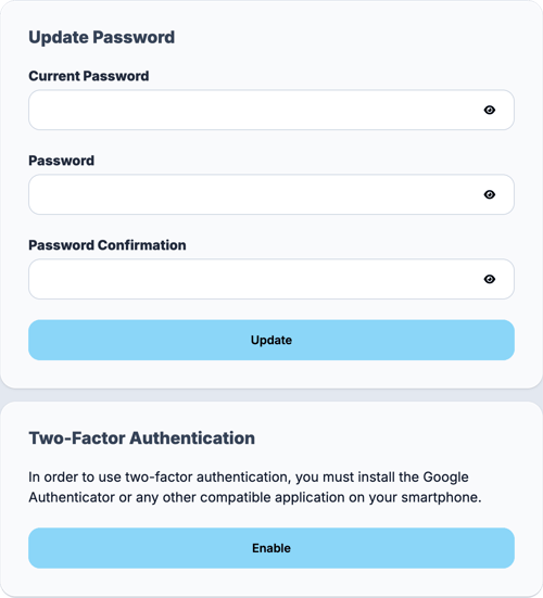 In this section, you can update your password for your Voxie user. You will need to know your current password and type the new password twice to confirm.