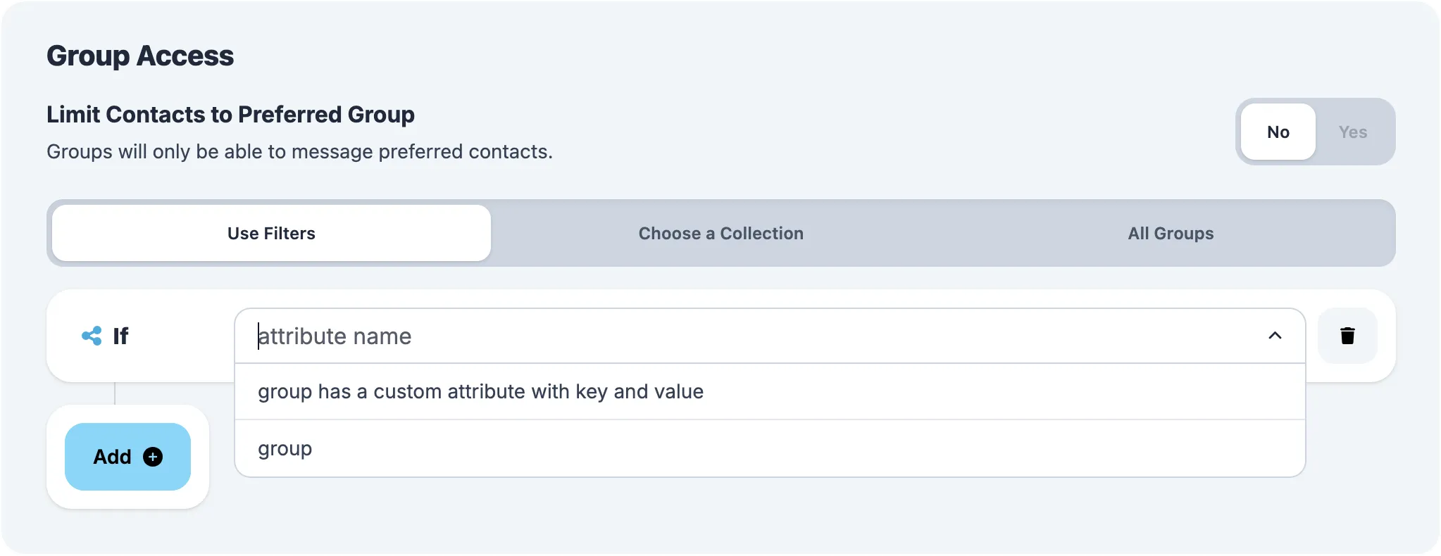 Use Filters: It allows corporate to Segment Groups by matching either the Group explicitly or the Groups Custom Attributes
