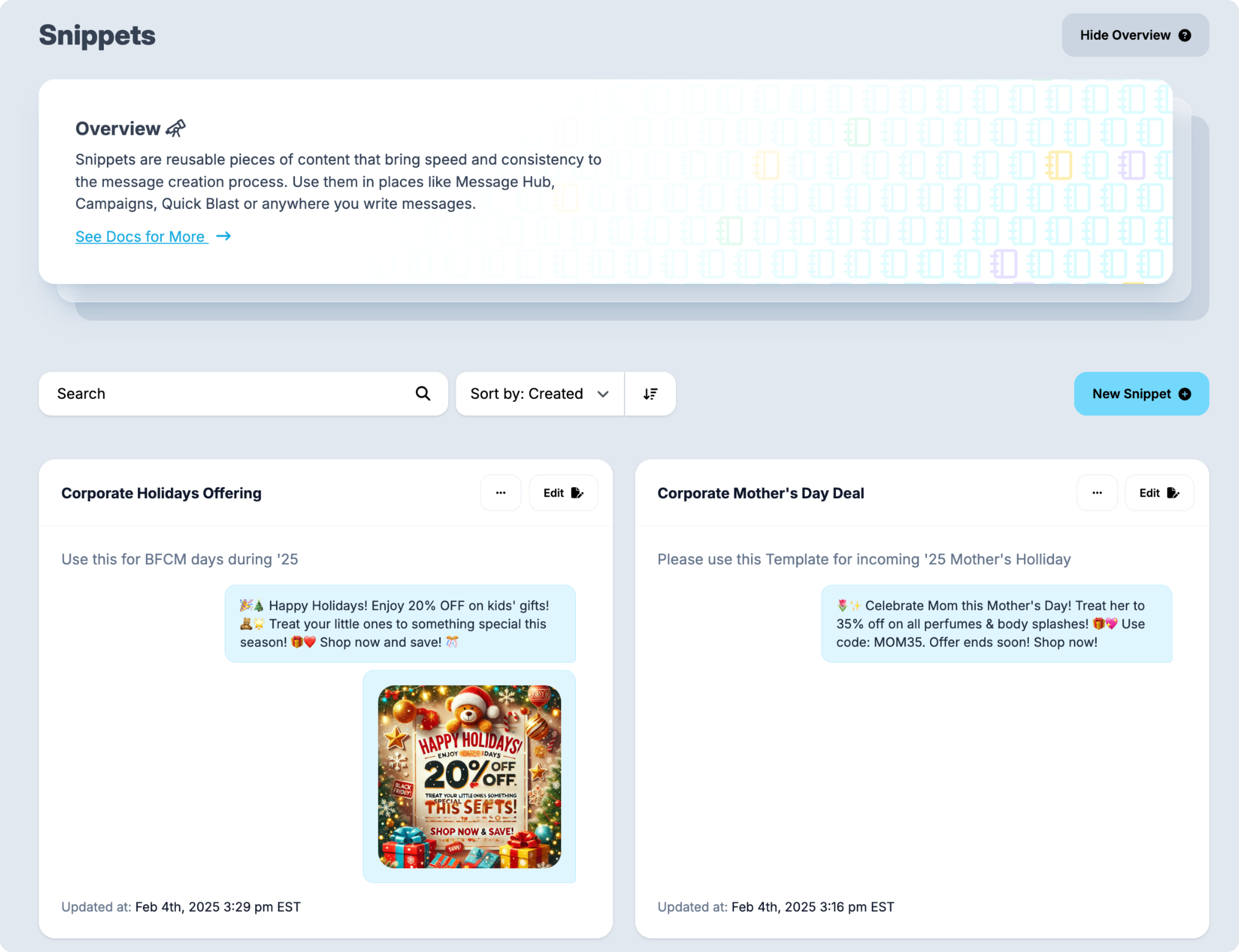 Once Groups is enabled you can access it within your Corporate section, in Messaging > Snippet Templates once there, you’ll find a list your Snippet Templates